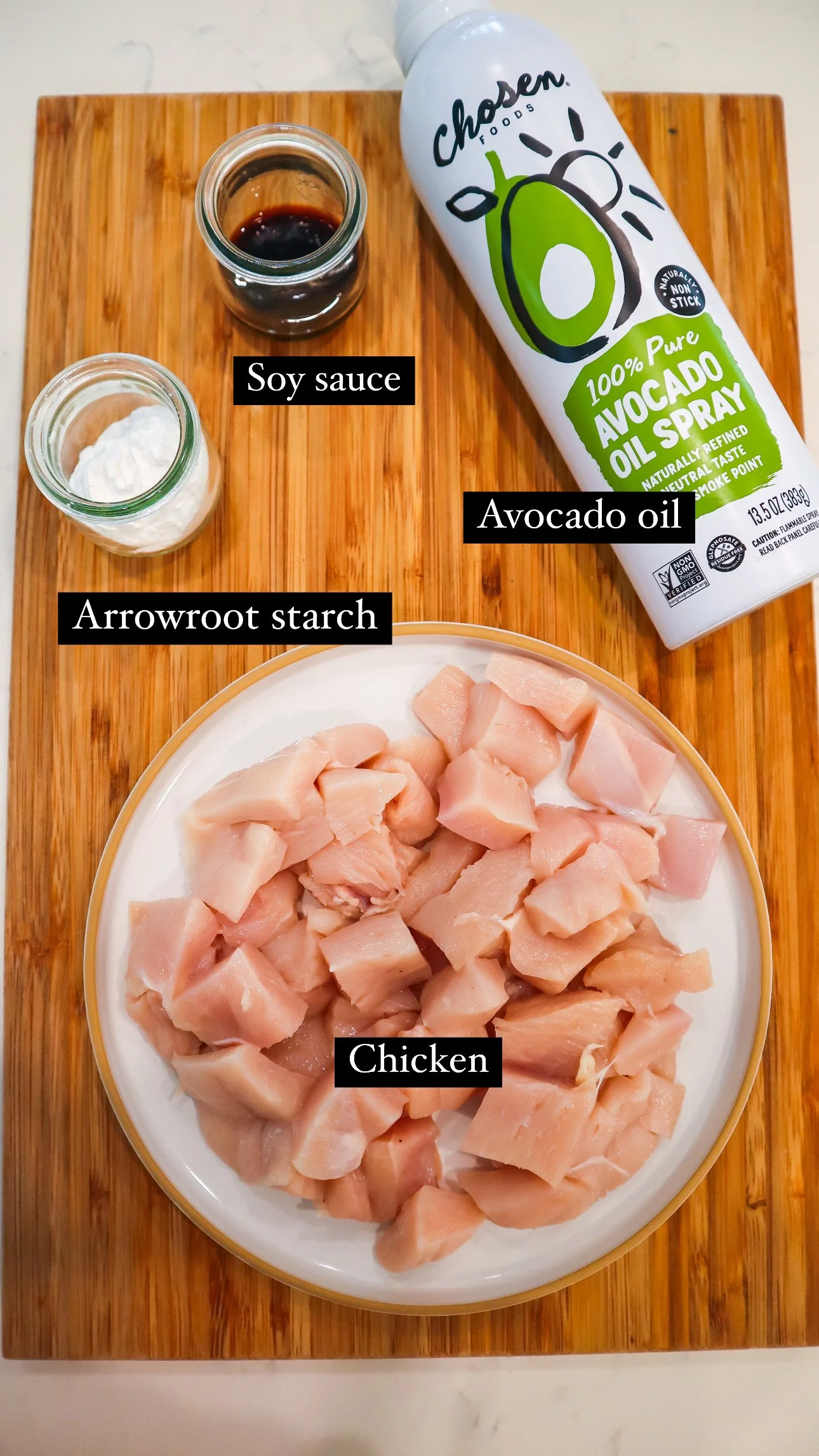 To start, preheat your air fryer to 400°F. Cut the chicken into 1-inch bite-sized pieces and place them in a large bowl with the soy sauce. Mix to combine and let the chicken marinate for about 10 minutes. While waiting, prepare the remaining ingredients.