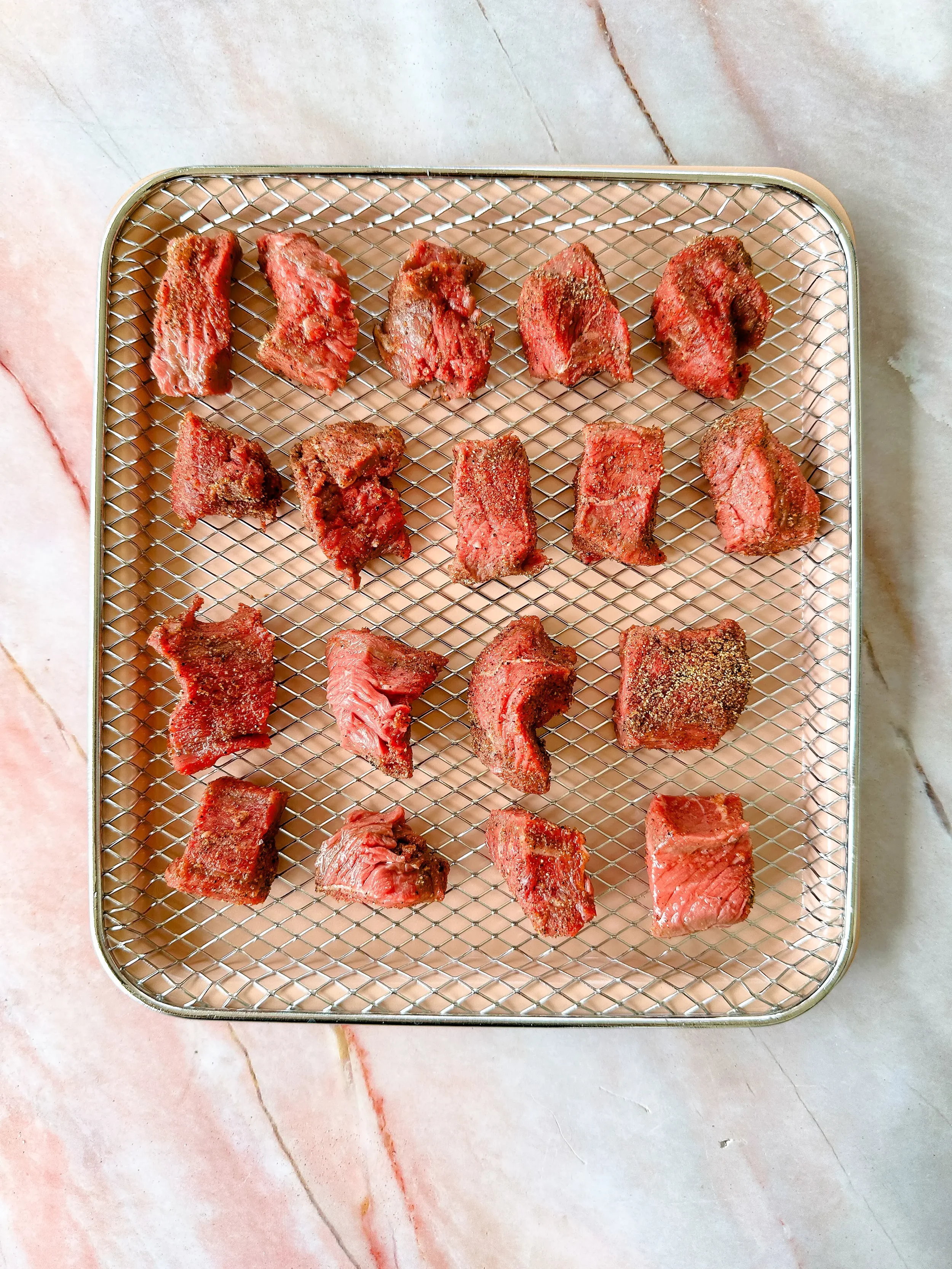 Tough steak usually means it cooked too long. Steak bites cook quickly in the air fryer, so checking the internal temperature is the easiest way to prevent overcooking. Make sure the pieces are similar in size so everything cooks at the same pace.