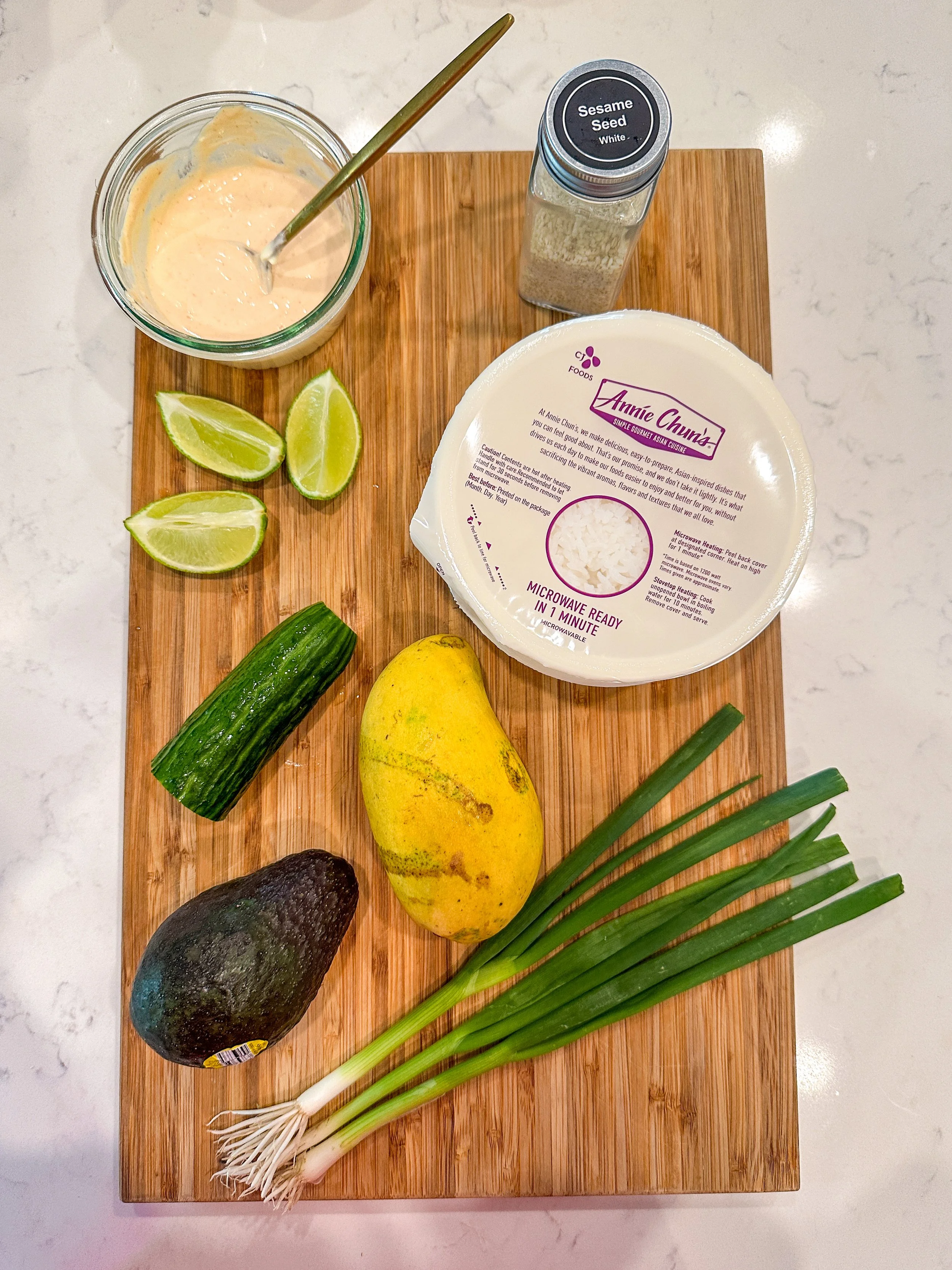 Mix together the spicy mayo by combining mayonnaise, sriracha and lime in a bowl. Mix well to combine. Drizzle that over the bowl.