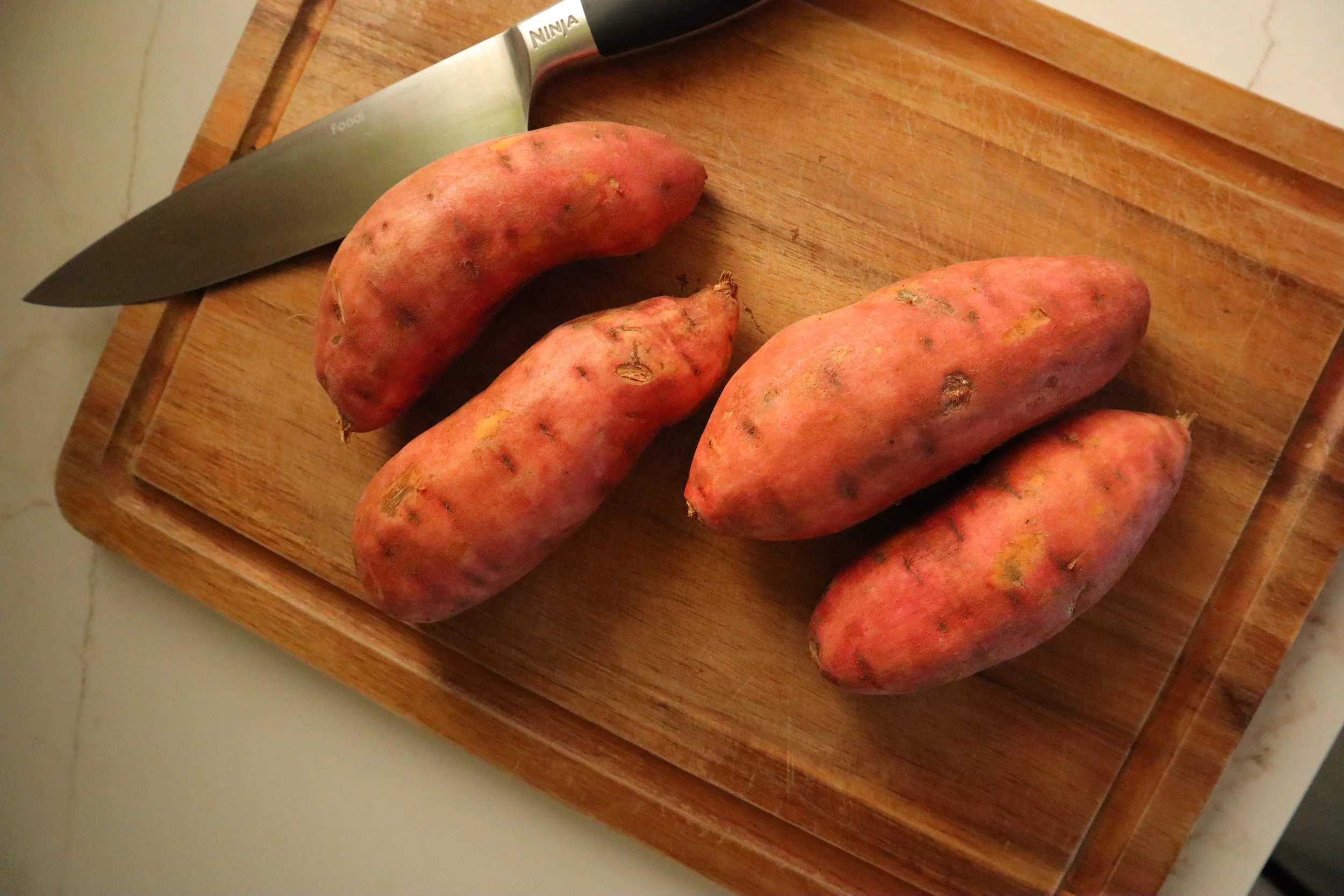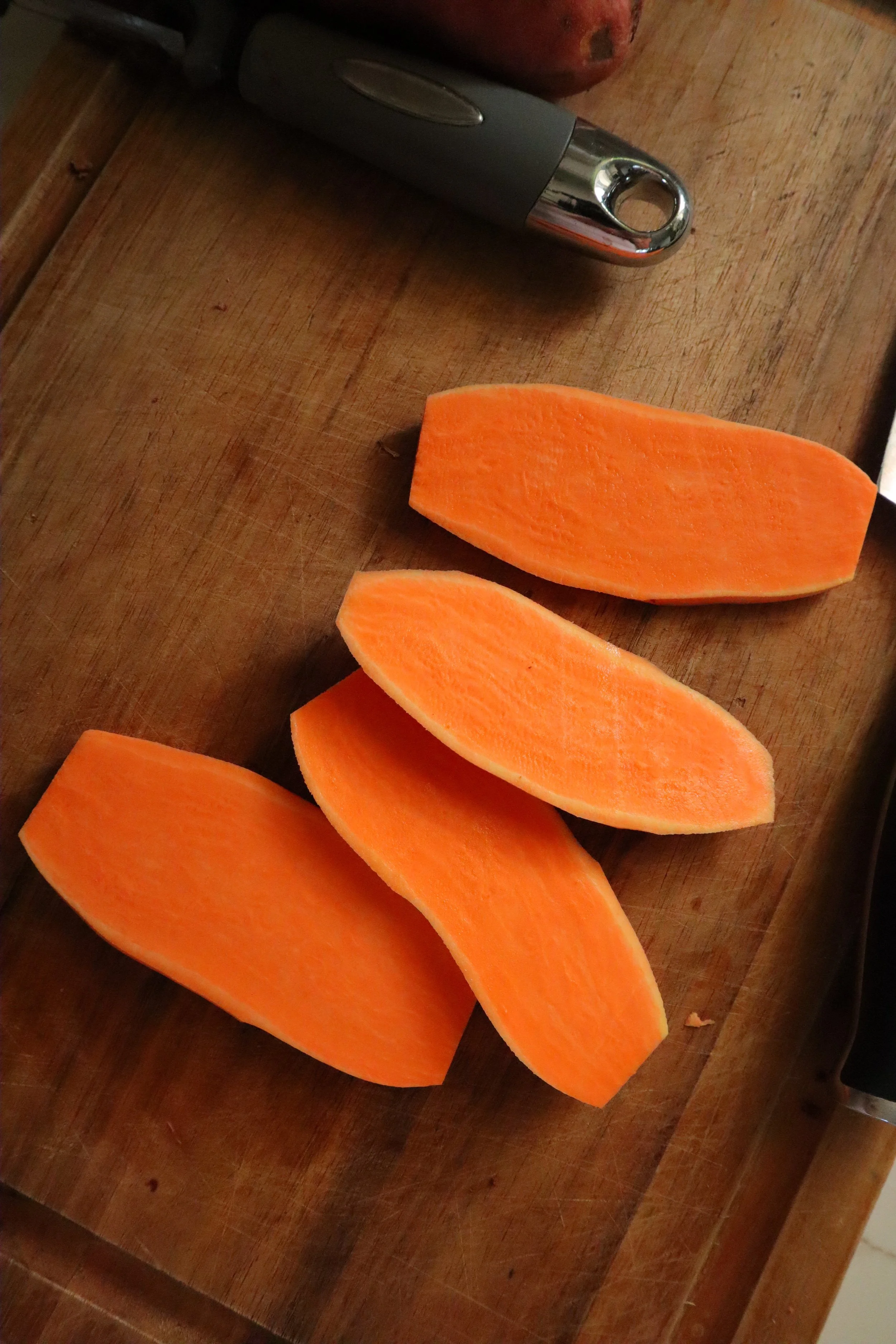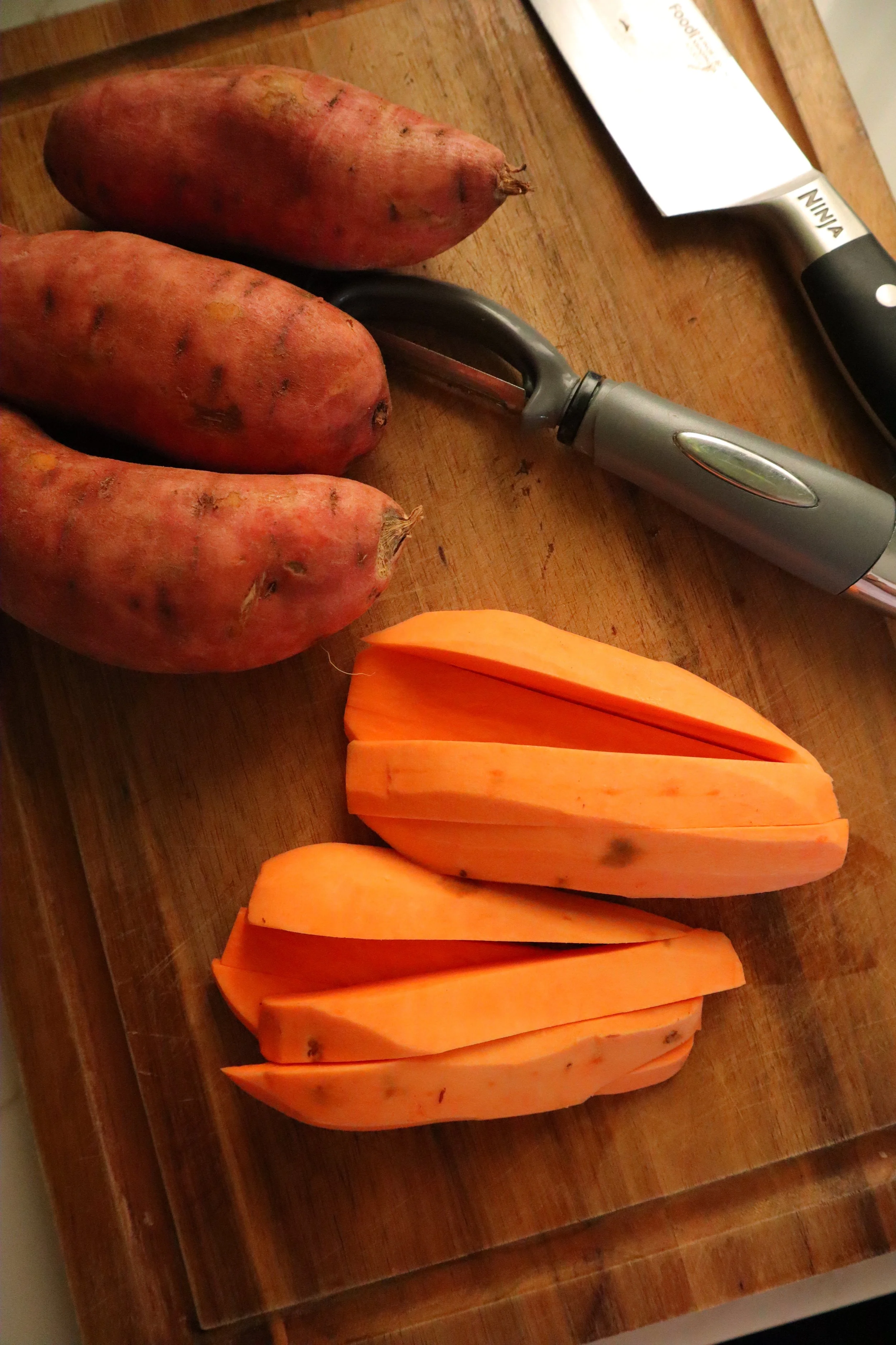 Cutting sweet potatoes can be tricky because they’re so firm. Here’s my go-to method: