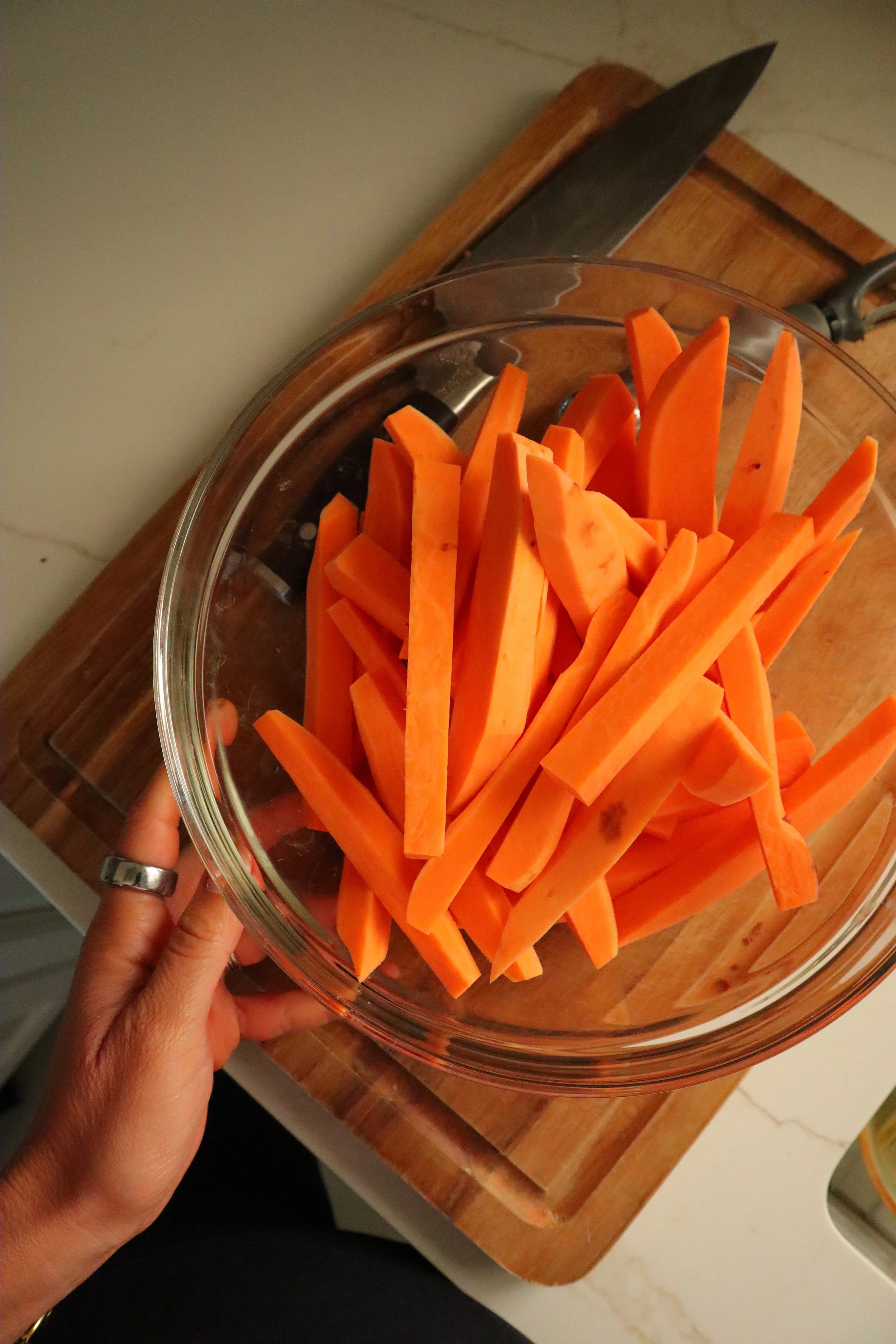 4 medium sweet potatoes (about 3 lbs total), peeled and cut into fries