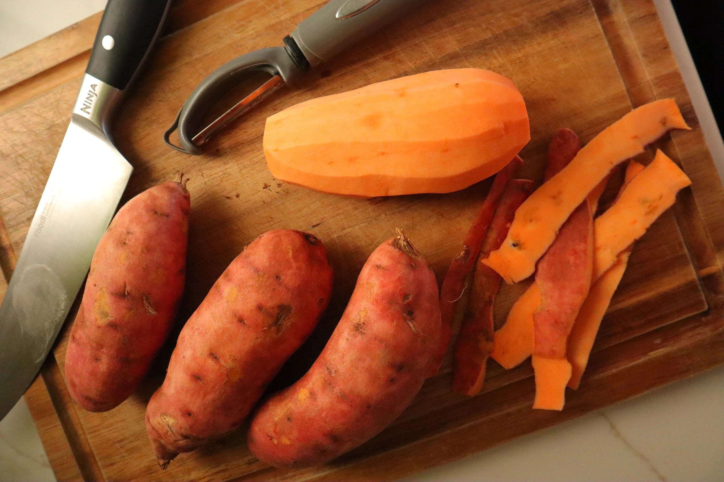Rinse the sweet potato under cool water and peel with a vegetable peeler to remove the skin.