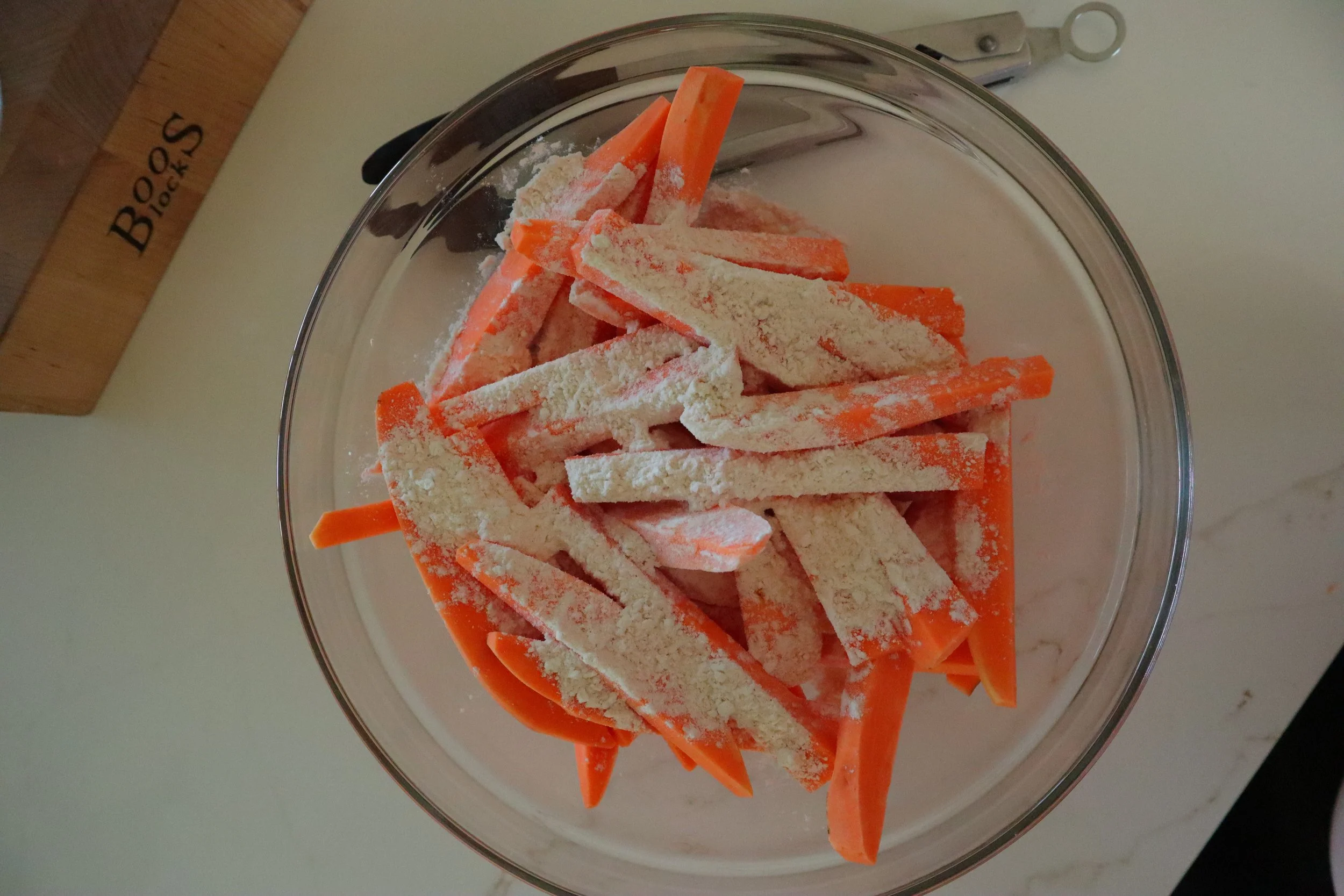 3. Add fries to a large bowl. Sprinkle arrowroot starch or cornstarch (if using) and toss to coat evenly. Then drizzle in avocado oil and toss again.