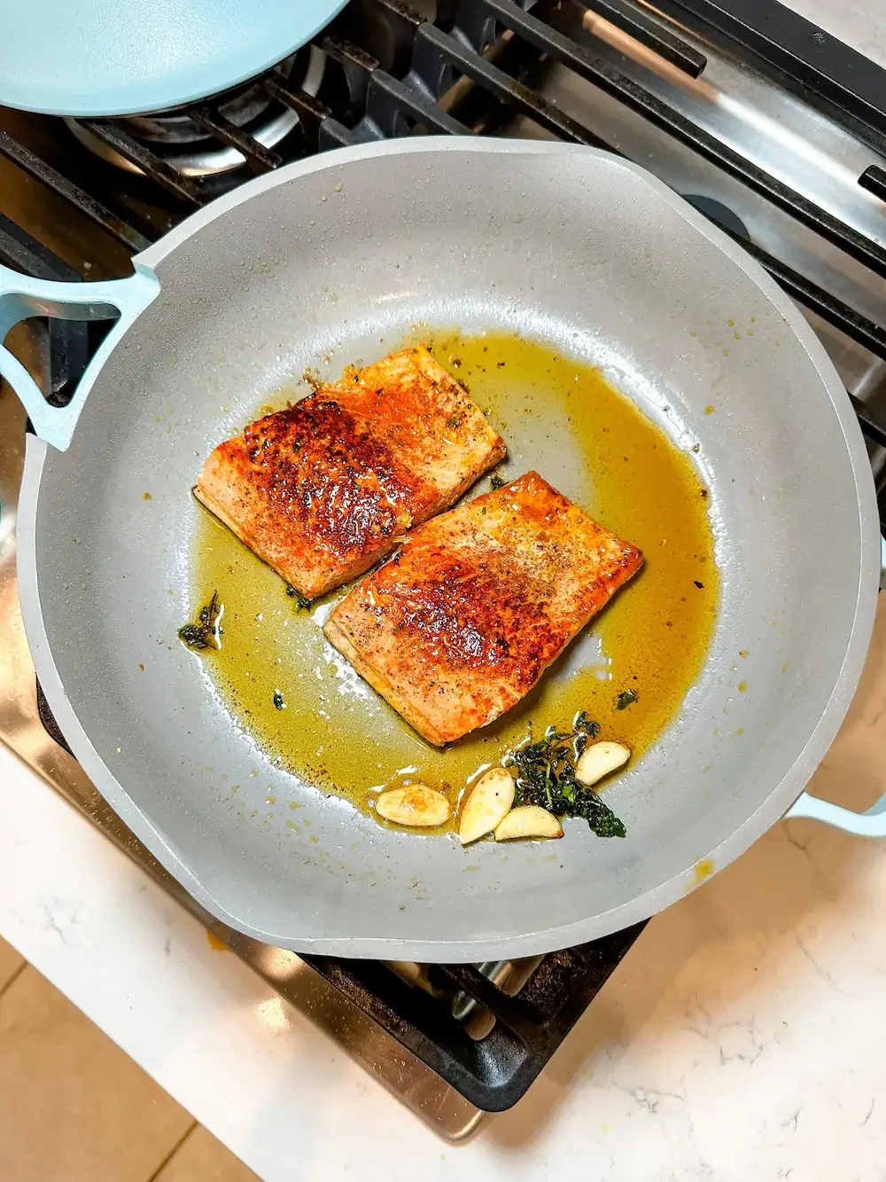 Reduce the heat to low and let the salmon sit in the herbed butter for 6 minutes, basting it occasionally.