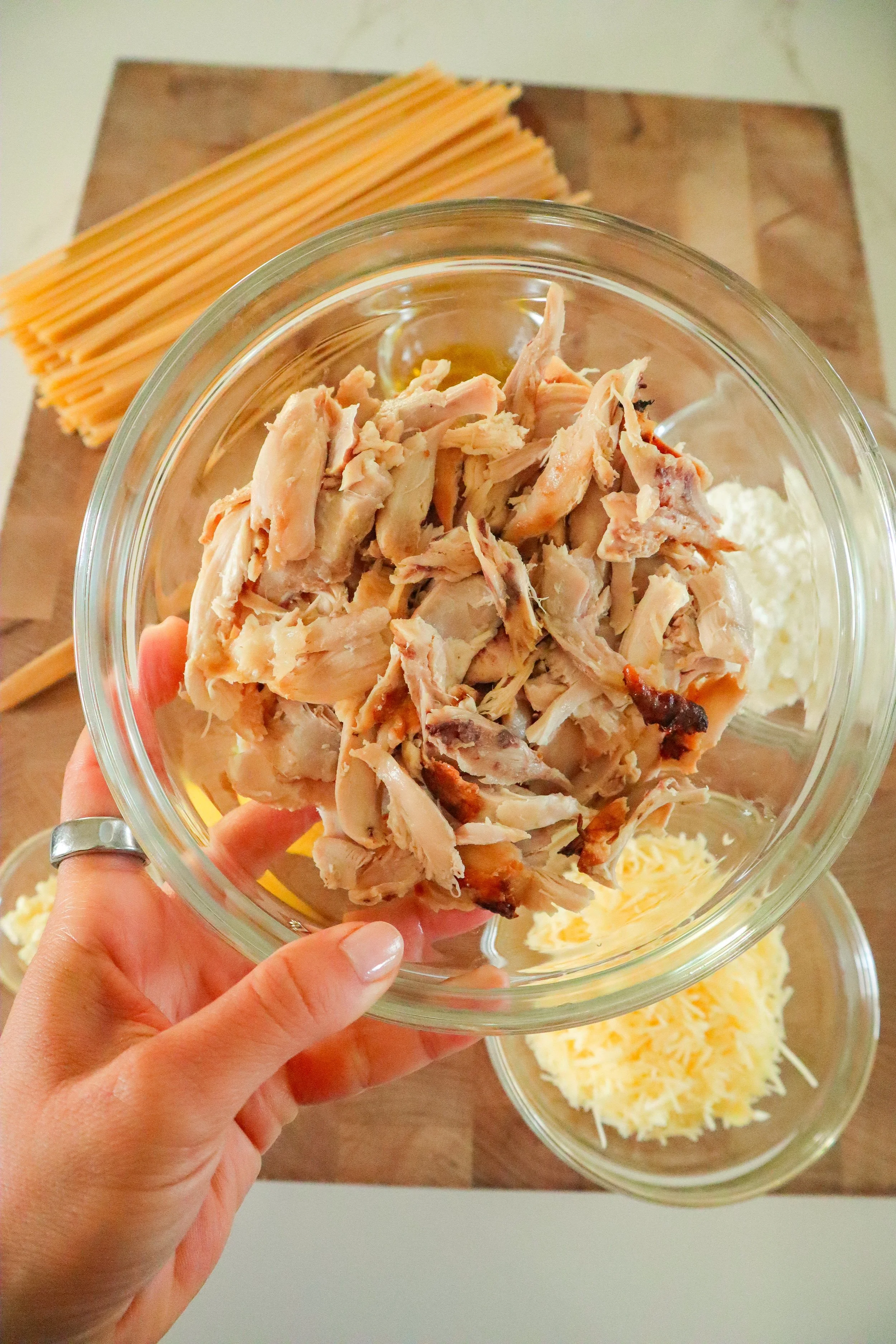 For this recipe you need about 3 cups of shredded chicken, which is roughly half of a standard rotisserie bird. The other half keeps in the fridge for 3-4 days.