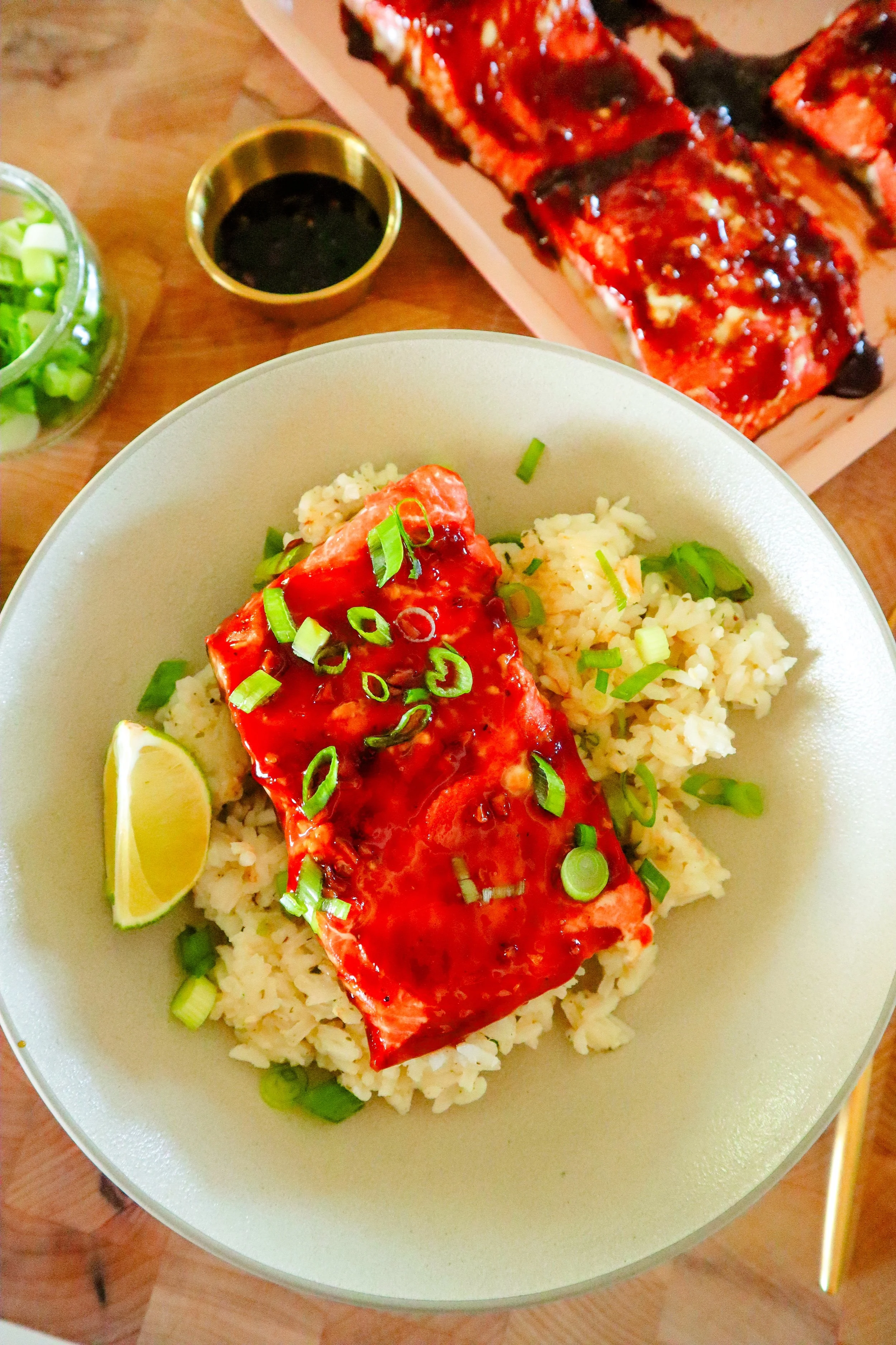 This recipe comes together in just about 20 minutes, making it perfect for busy weeknights. While the salmon cooks, I’ll throw on some fluffy white rice and sauté a few veggies on the side. We’ve been loving it with mushrooms, sesame seeds, and green onions lately.