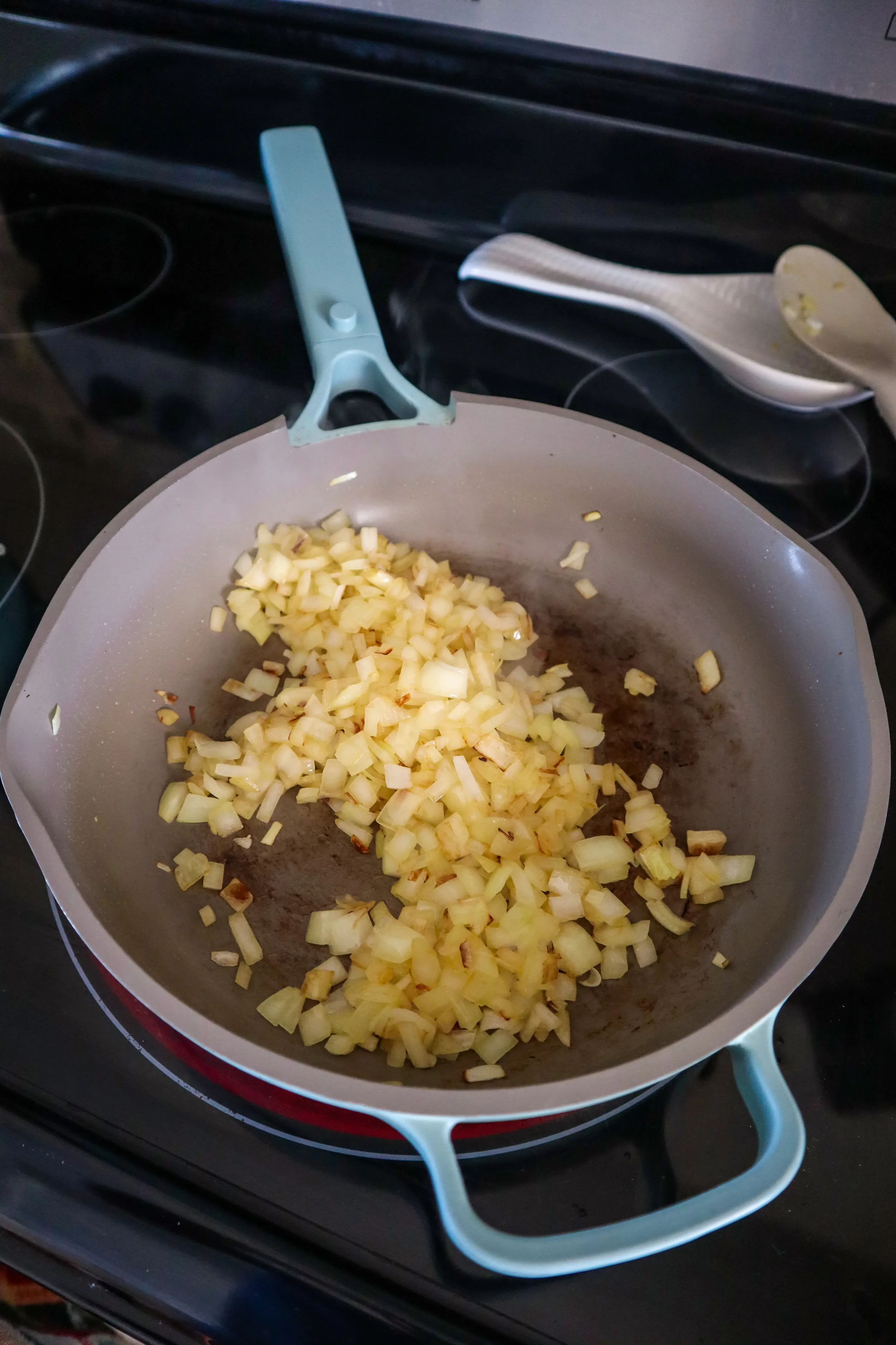 Heat one tablespoon of olive oil in a skillet over medium heat. Once the oil is hot, add the chopped onion and sauté until soft and golden brown, about five to seven minutes.