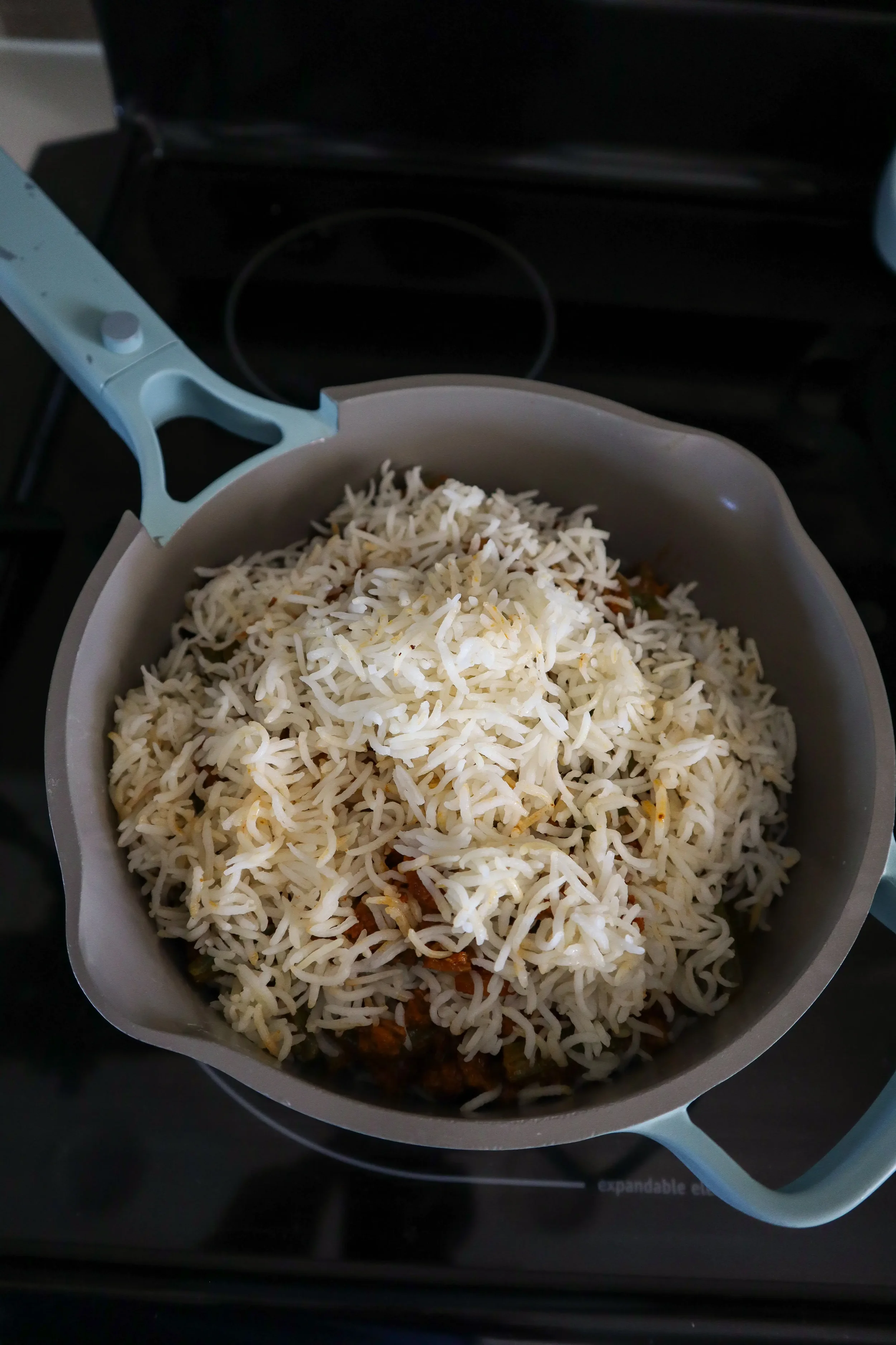 Add the basmati rice to the pot you will be using to cook the rice. Rinse the basmati rice under cold water until the water runs clear, about three to four times.