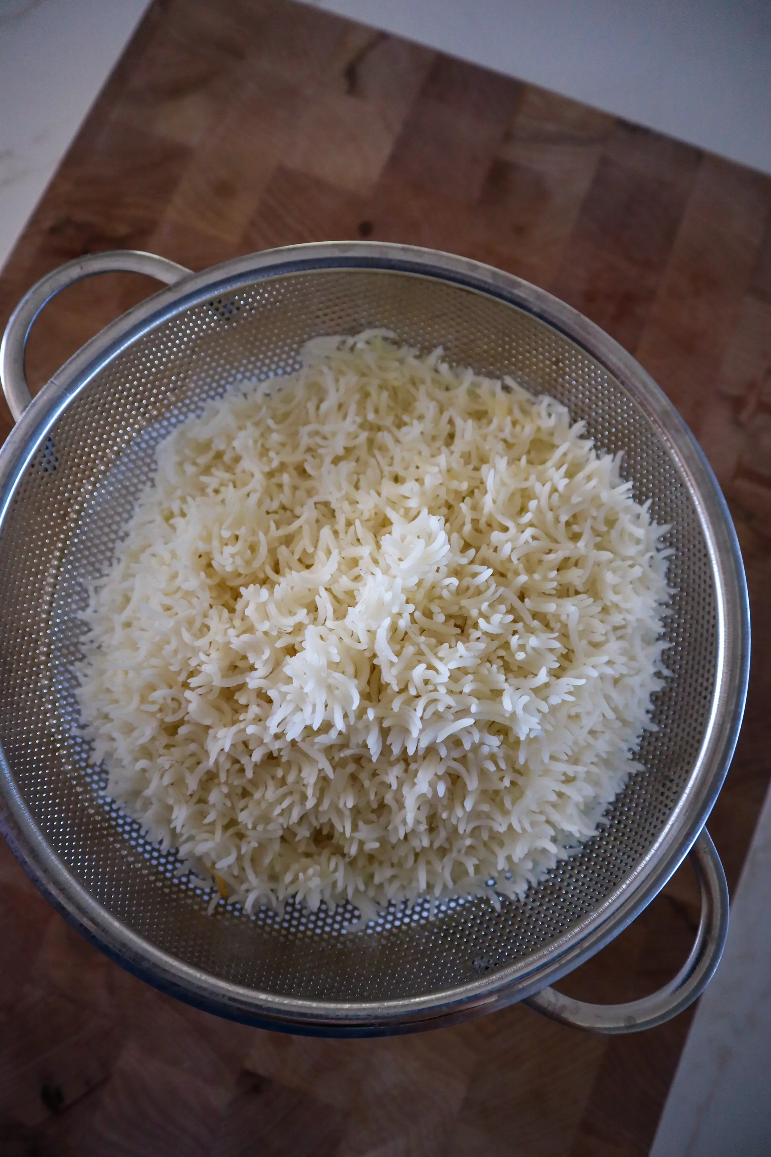 In a large pot, bring the rinsed basmati rice, salt, and three cups of water to a boil. Let the rice cook in the boiling water for about five to seven minutes, until it is slightly tender but not fully cooked. You are looking for rice that is al dente. If you place a grain of rice in your mouth, it should still have a slight bite. It will continue cooking later.