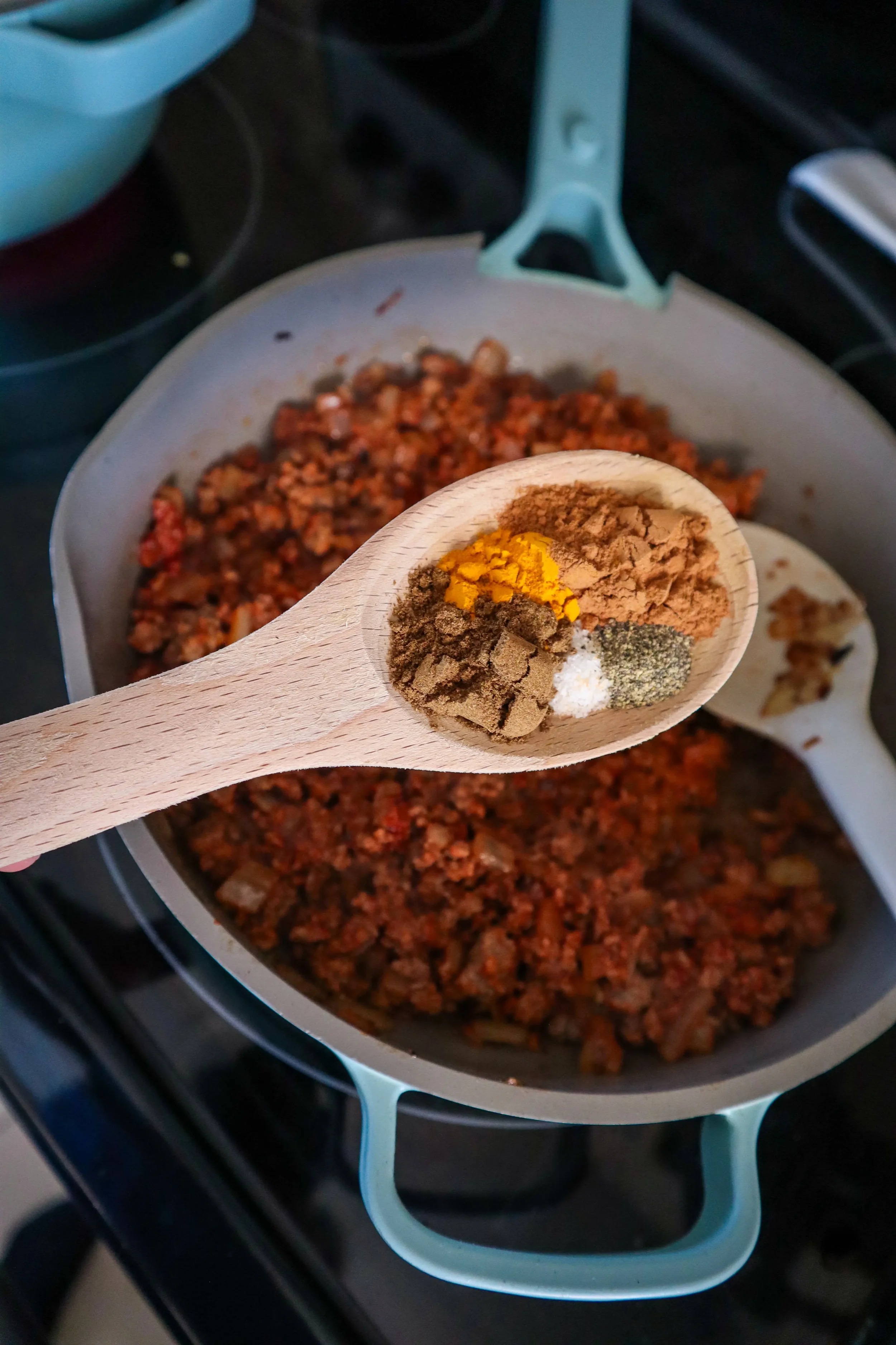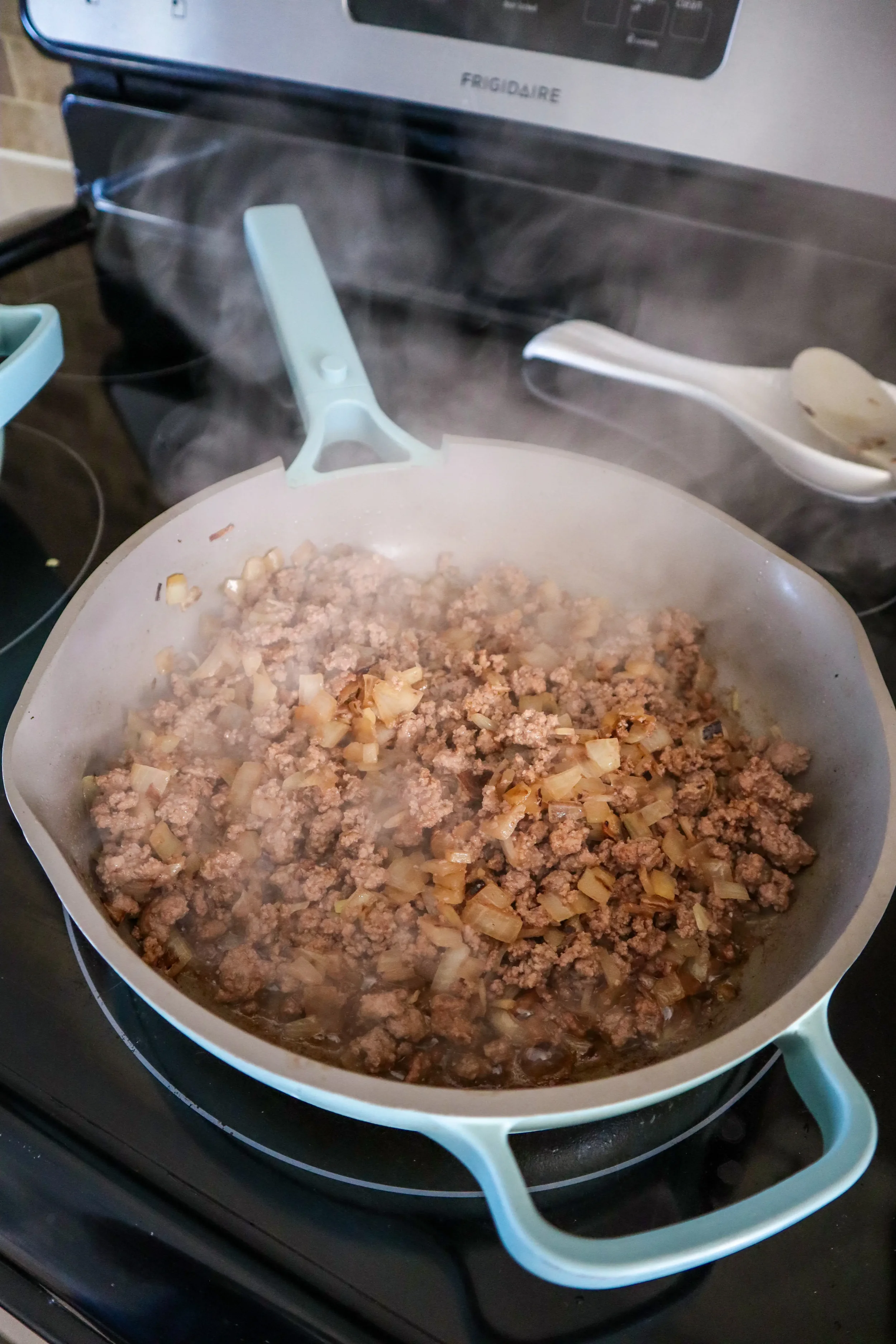 Add the ground beef to the skillet and cook until the meat is browned, breaking it apart with a spoon. This should only take a few minutes.