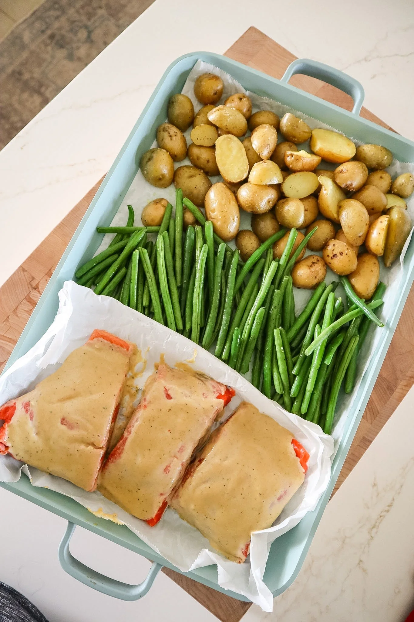 The raised edges also make a big difference. With a 5-quart capacity, it can actually hold liquids, which is something a standard flat sheet pan cannot do.