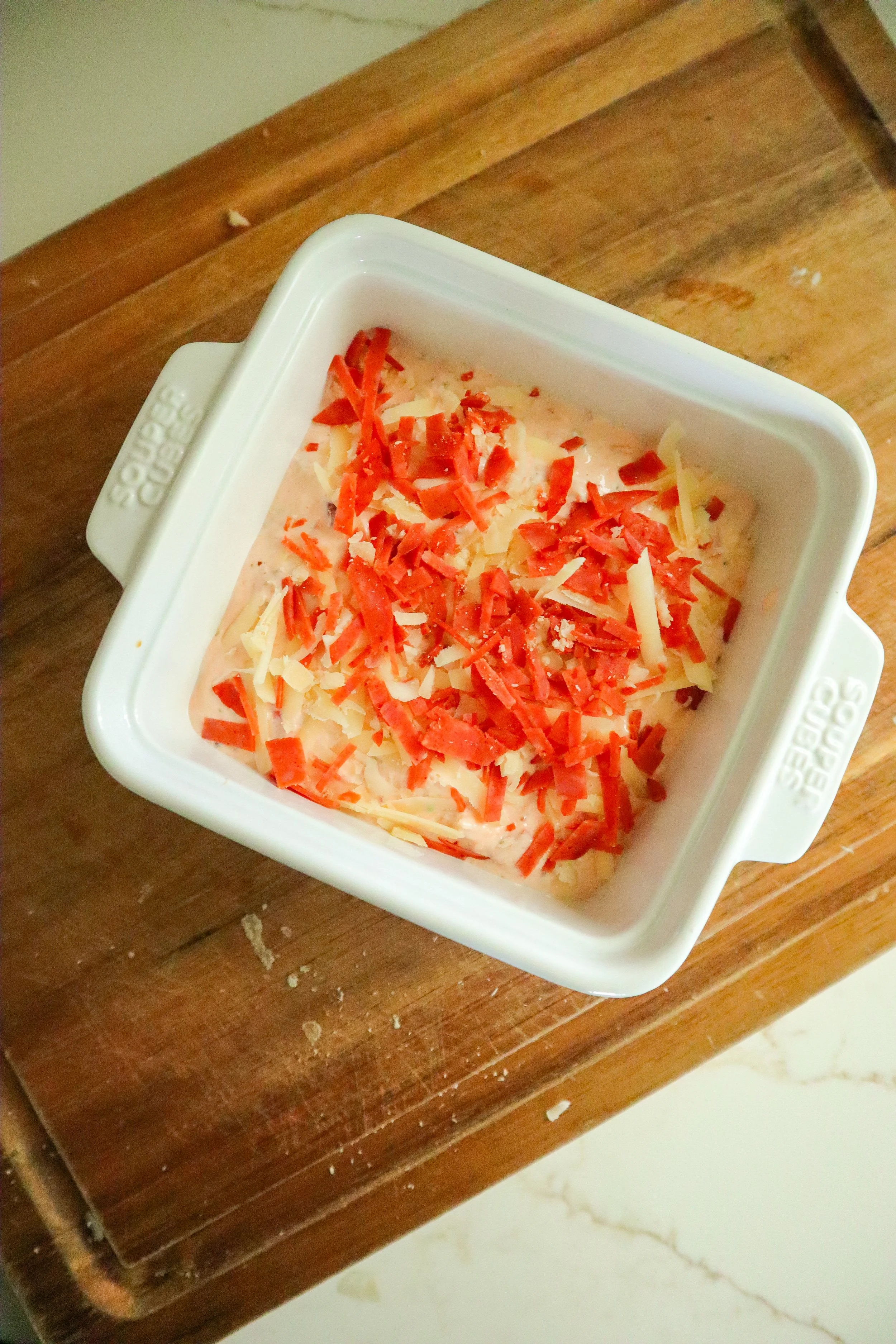 A few extra slices of turkey pepperoni and a sprinkle of parmesan on top help the dip brown nicely and get that melty finish.Want it golden?