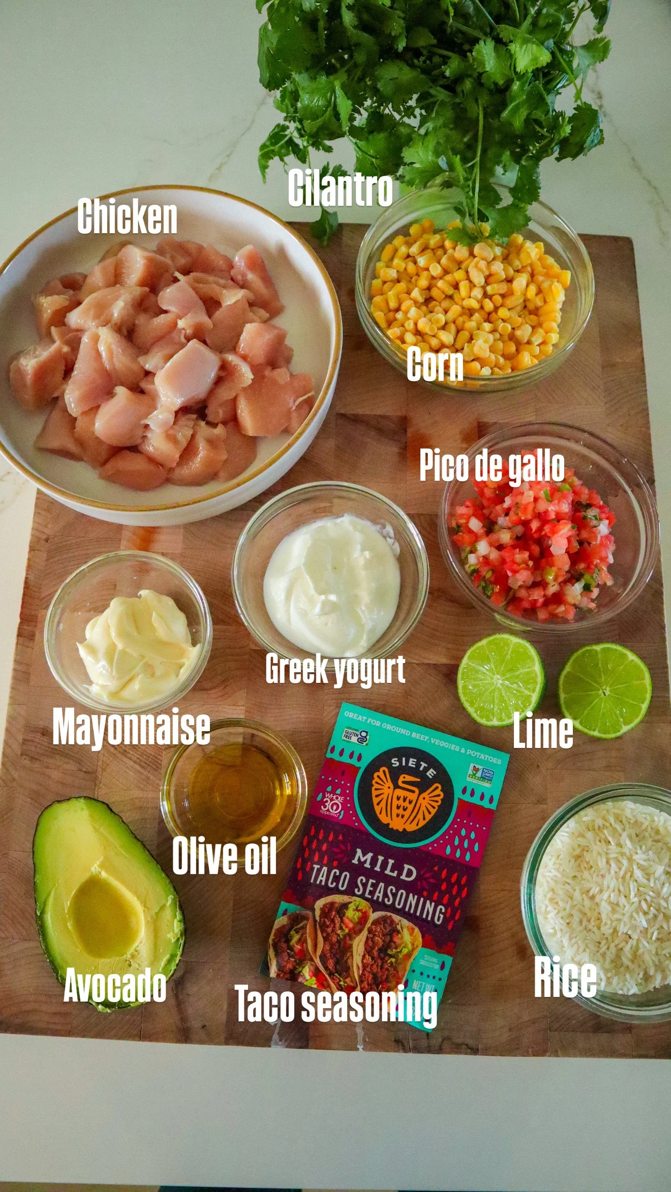 Step 5: Assemble the bowls Divide the rice between four bowls. Top with charred corn and pico, cooked chicken, and avocado slices. Spoon more pico de gallo over everything, drizzle with the lime crema, fresh avocado and finish with fresh cilantro and hot sauce if using.