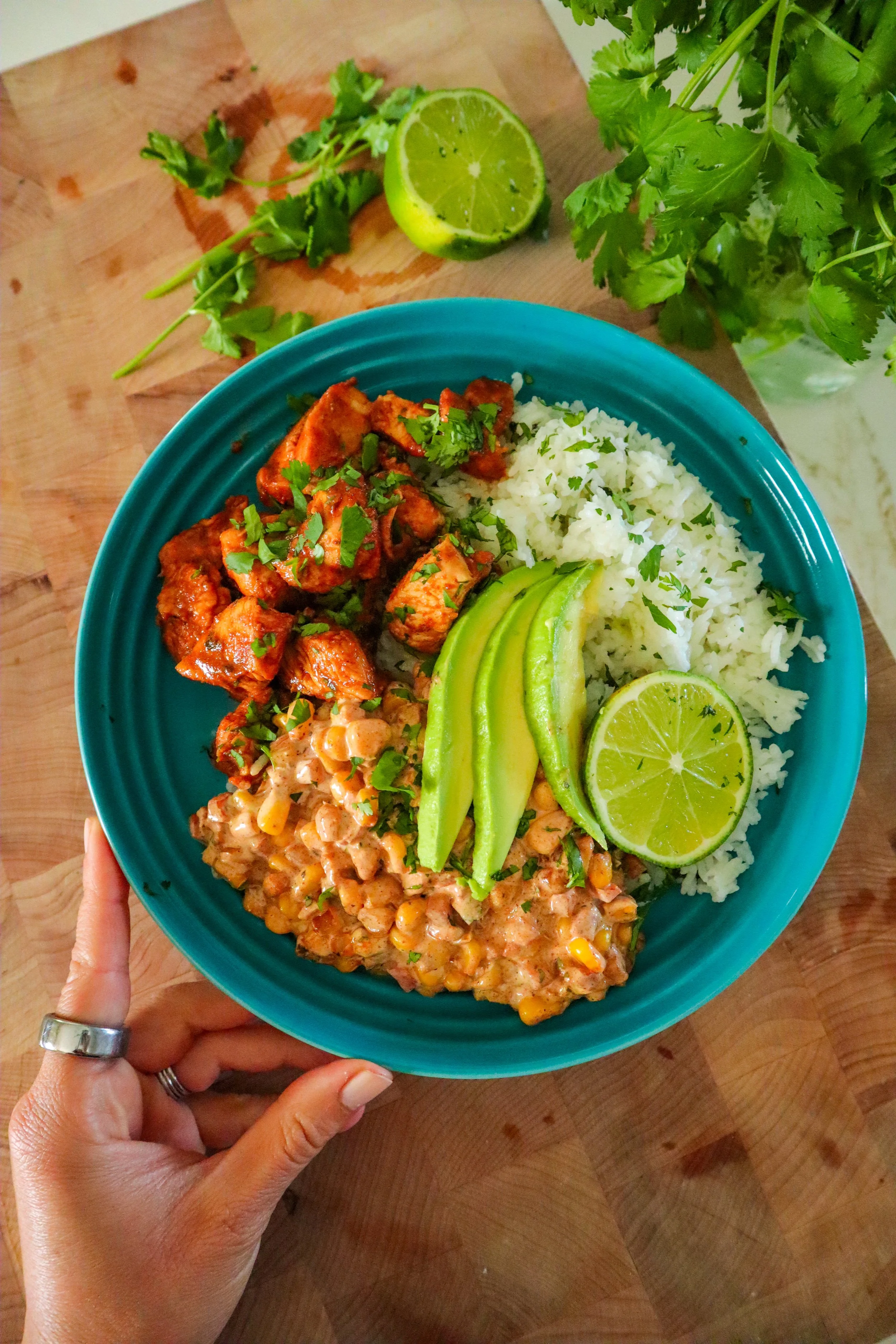 - Divide the rice between four bowls. Top with corn and pico, cooked chicken, and avocado slices. Spoon the lime lime crema, and finish with sliced avocado, fresh cilantro, lime juice and hot sauce if using.